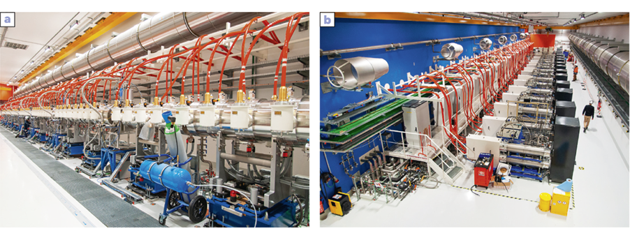 Photographies de [a] l’accélérateur de l’axe 3 d’Epure composé de l’injecteur et des 64 cellules accélératrices qui sont alimentées par [b] 16 générateurs à haute tension au moyen de 128 câbles à haute tension (rouge).