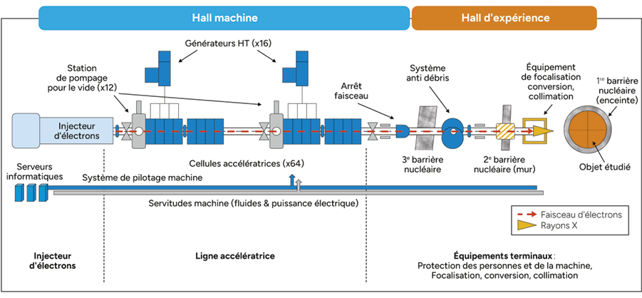 Les trois sous-ensembles principaux d’un LIA : l’injecteur du faisceau d’électrons, la ligne accélératrice composée de 64 cellules, la partie terminale comprenant notamment l’équipement de focalisation, de conversion et de collimation.