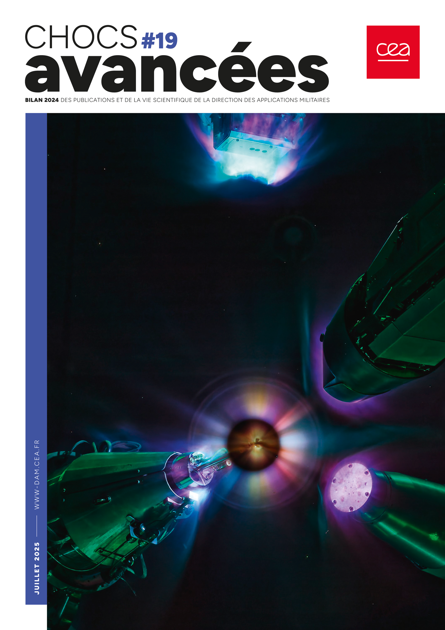 Photographie prise de l’intérieur de la chambre d’expériences du Laser Mégajoule lors de la focalisation des faisceaux laser dans une cavité de fusion (voir articles p. 10-11 et p. 36-37). La cavité est positionnée au centre de la chambre par un inserteur (en bas, à gauche). L’image intégrée en temps montre le plasma généré sur la cible (au centre du halo coloré) pendant l’interaction qui ne dure que quelques milliardièmes de seconde. Les différentes couleurs du halo sont caractéristiques des matériaux de la cible. Les rayonnements X émis par la cible illuminent les diagnostics de l’expérience (en haut et à droite) et créent un plasma qui rayonne une lumière bleu-violet.