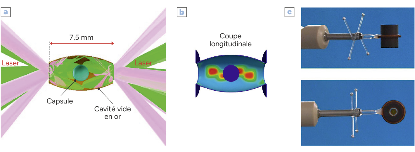 Regroupés par quatre, les faisceaux laser entrent dans la cible par deux trous situés aux deux extrémités de la cavité (figure 1a). Ils se propagent et atteignent les parois internes qui les absorbent. La coupe longitudinale de la figure 1b montre l’impact de ces faisceaux. Cette absorption laser chauffe les parois internes en or, qui se détendent en émettant du rayonnement X. C’est ce rayonnement X qui exerce une pression sur toute la surface de la capsule qui s’effondre sur elle-même et, de ce fait, comprime le deutérium.