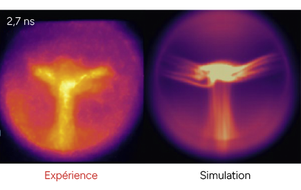 L’accord entre les simulations 3D et l’expérience est très satisfaisant (figure 2), il valide les modèles implémentés dans le code. Lors de l’expérience, une image du rayonnement X est enregistrée avant le démarrage des réactions de fusion. À cet instant, les parois d’or sont chauffées et en phase de détente, elles collisionnent au centre de la cavité. Une forme en Y (figure 2) est obtenue pour l’émission X, caractéristique de l’asymétrie liée à l’utilisation de 48 faisceaux.