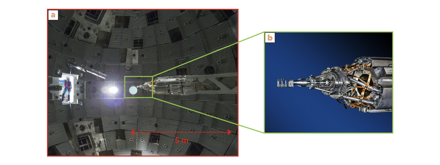[a] Photographie de la chambre d’expériences de dix mètres de diamètre, la partie située à l’intérieur de la chambre du bras robotisé constituant le porte-cible est visible. [b] Zoom sur l’extrémité du porte-cible qui maintient les cibles des expériences de fusion nucléaire (voir aussi les photos dans l’article « Laser Mégajoule : succès de la première expérience de fusion »). Différentes pièces du porte-cible doivent être choisies et dimensionnées pour encaisser au mieux des contraintes mécaniques sévères occasionnées par l’absorption de l’énergie laser dans la cible.