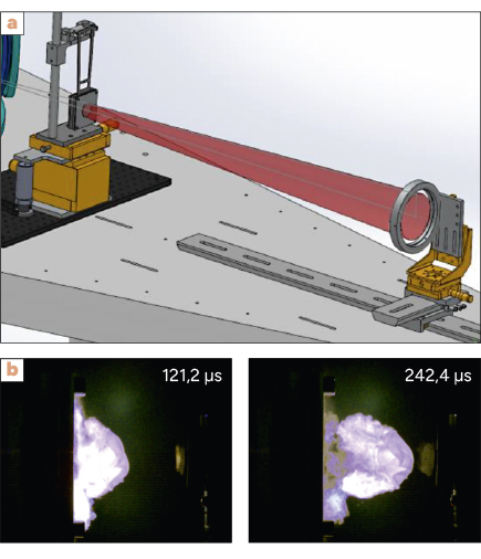 [a] Schéma de l’expérience sur laquelle est positionné (à gauche) un pendule dont on connaît les caractéristiques mécaniques (dimensions, masse, etc.). Le laser (en rouge) est focalisé par une lentille jusqu’à la cible portée par ce pendule. [b] Images de la surface de la cible lors du tir laser montrant la création du plasma puis sa propagation dans l’air.