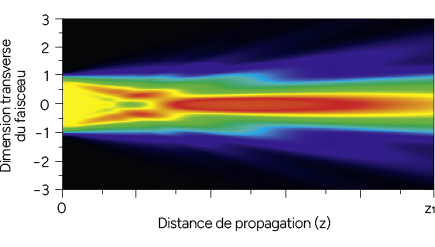 Afin d’illustrer le fait que la propagation des rayons permet de rendre compte de la diffraction et des interférences, nous avons représenté la visualisation d’un cas d’école. Dans cette expérience, un faisceau illumine un écran percé de deux trous. Après la propagation du faisceau au travers des deux trous, des franges d’interférences apparaissent sur l’écran positionné plus loin (expérience des trous de Young). De façon plus imagée, le tracé de neuf rayons est représenté sur la figure 1, afin d’illustrer l’intérêt de véhiculer sur chaque rayon des énergies positives ou négatives pour que les franges apparaissent dans le plan d’observation. Un exemple de faisceau plus complexe que le faisceau gaussien est donné sur la figure 2. Cette figure donne une représentation de la fluence du faisceau en fonction de la distance de propagation z pour un faisceau de forme spatiale carrée. La forme carrée est approchée par une somme de dix gaussiennes.