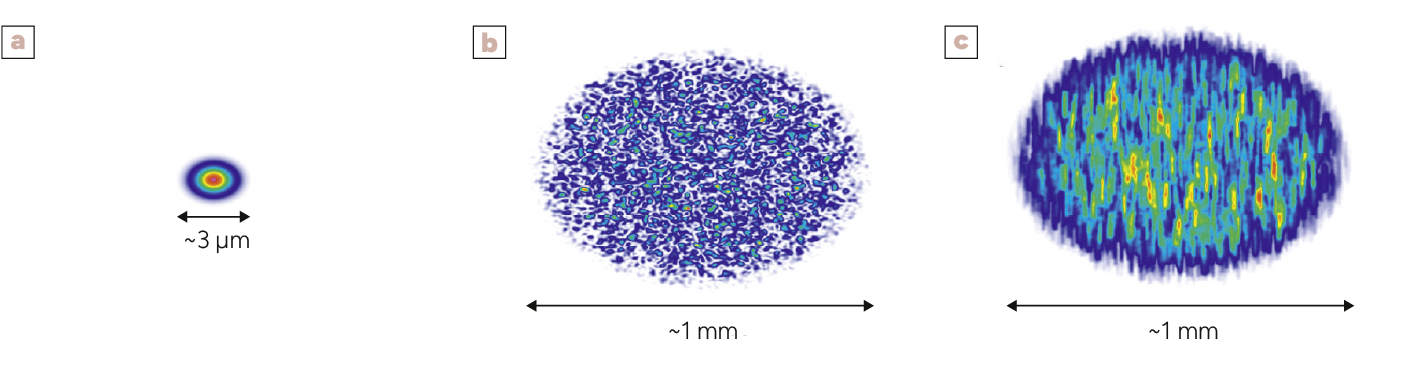 [a] Tache focale d’un faisceau du Laser Mégajoule à une seule longueur d’onde. [b] Tache focale du même faisceau dont l’énergie est étalée sur une grande surface adaptée à la cible ; des surintensités apparaissent et créent une microstructuration. [c] Tache focale du même faisceau dont la longueur d’onde varie dans le temps et sur la surface de la tache : les surintensités sont lissées. Ces images sont issues de simulations numériques. Dans l’échelle de couleur, le rouge (resp. le blanc) correspond au maximum (resp. minimum) d’intensité, intensité maximale différente pour chaque image.