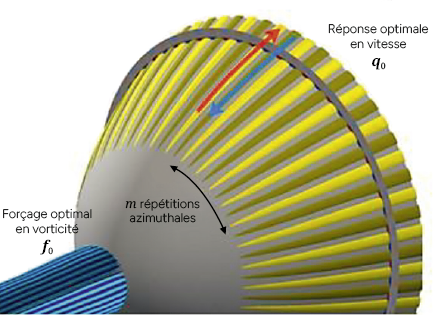 Vue générale des perturbations optimales tourbillonnaires (bleu) impactant le point d’arrêt pour donner une réponse optimale en vitesse (jaune).