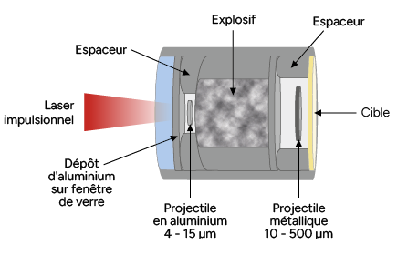 Pour acquérir des données expérimentales, on génère habituellement des chocs en utilisant des canons qui sont conçus pour lancer des projectiles sur des cibles de grandes dimensions. Ces expériences nécessitent des équipes nombreuses et de grandes installations ainsi qu’une quantité importante de matière (plusieurs grammes). Cela devient rédhibitoire lors du développement d’un nouvel explosif pour lequel la quantité de matière disponible est limitée.