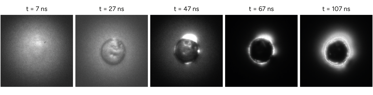 Images d’un projectile d’aluminium volant à 12 000 km/h à différents instants au cours de son vol. La dernière correspond à l’instant d’impact sur l’explosif. Nous constatons la très bonne planéité du projectile et sa parfaite intégrité.