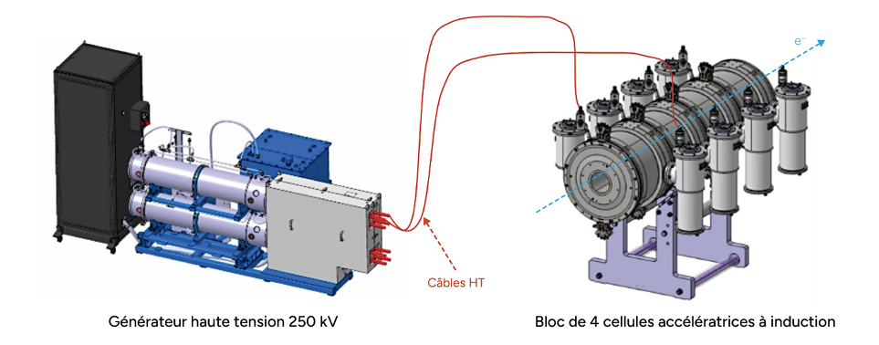 Les cellules à induction sont constituées d’une anode et d’une cathode entre lesquelles un champ électrique est appliqué, délivrant au faisceau d’électrons une énergie complémentaire de 250 keV, soit au total 64 × 250 keV = 16 MeV. Ainsi, le faisceau d’électrons en fin de ligne accélératrice aura une énergie d’environ 20 MeV (4 MeV en sortie d’injecteur + 16 MeV le long de la ligne accélératrice). Chaque cellule comprend également un solénoïde centré sur l’axe de propagation du faisceau, qui génère le champ magnétique de guidage. Finalement, chaque cellule est équipée de correcteurs de trajectoire.