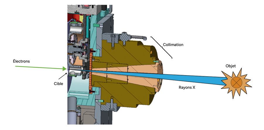 - La collimation : lors de l’interaction entre le faisceau et la cible, un lobe de rayonnement X est émis dans toutes les directions de l’espace. Il convient de mettre en place un système de filtrage spatial pour ne conserver que les rayons X émis en direction de l’objet étudié et protéger ainsi des matériels dans le hall d’expérience, tels que les matériels de mesure, les matériels électroniques de pilotage d’équipements, etc. La figure 7 illustre l’effet de la collimation.